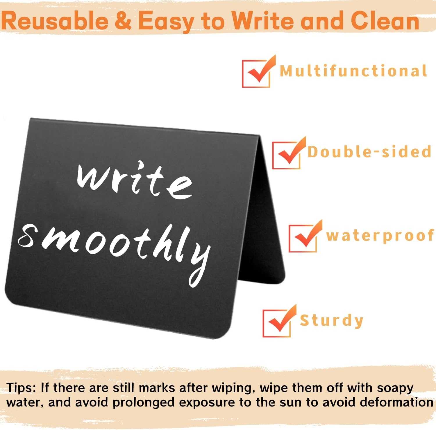 - STURDY CONSTRUCTION: The small chalkboard sign is made of dark matte black plastic material, sturdy and waterproof, not easily deformed or broken, each sign features V-shaped design that keeps it upright and visible, with a writing surface that's easy to read