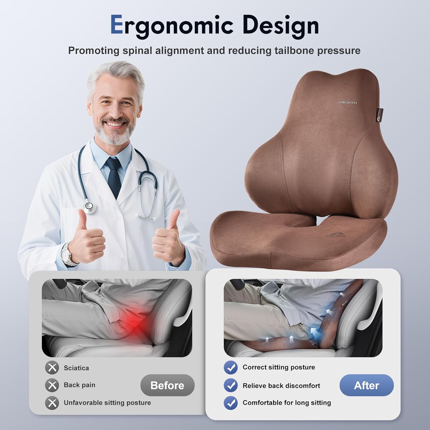 Coverado Memory Foam Car Seat Cushion and Lumbar Support Pillow for Car, Ergonomic Office Chair Cushion for Lower Back Pain Relief, Breathable & Non-Slip for Car, Home, and Office Use, Coffee