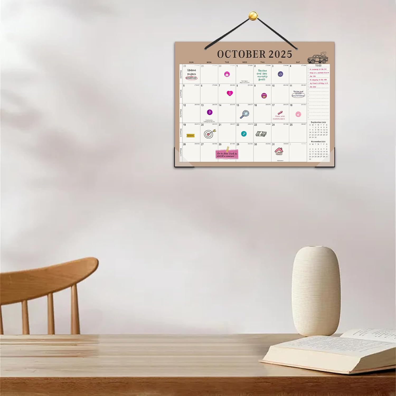 - 📔【For Wall/Fridge/Desk】Small calendar 2025-2026 comes with a magnetic strip, a hanging string and 3 stickers. It can be placed not only on the desktop, but also on the wall and refrigerator. Stickers help you plan your life better.