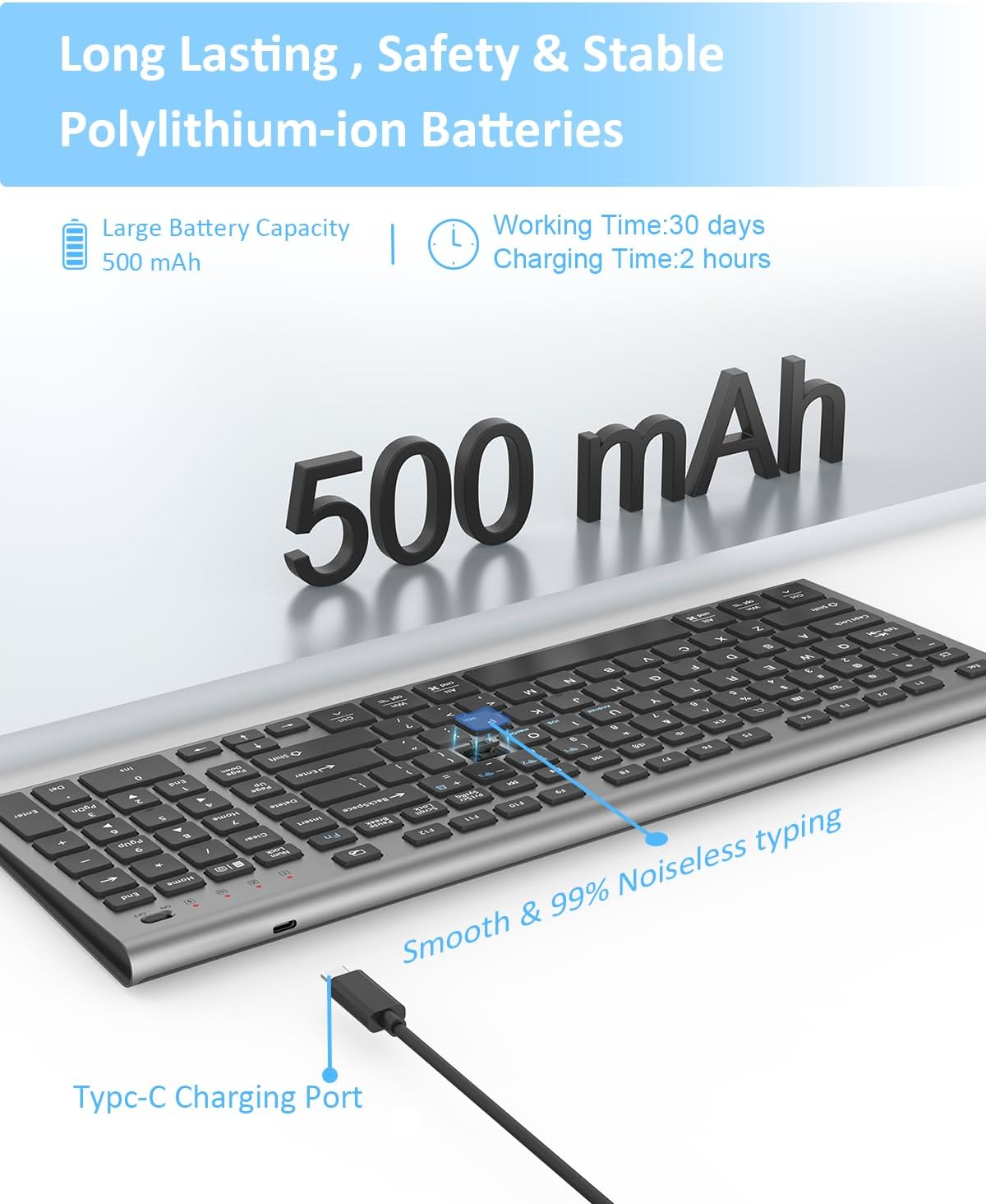 - ăEnvironmental Protection and Energy SavingăïŒNever worry about running out of power again! Our high-capacity long-lasting rechargeable battery. The battery capacity is about twice that of most standard wireless keyboards.No more tossing out disposable batteries; itâs eco-friendly and cost-saving. Type C charging port, charging takes about 1.5 hours, with a usage time to about 60 days (depending on usage habits). The smart low-battery reminder ensures youâre always prepared, whether youâre working on a cross-country flight or a long study session.â