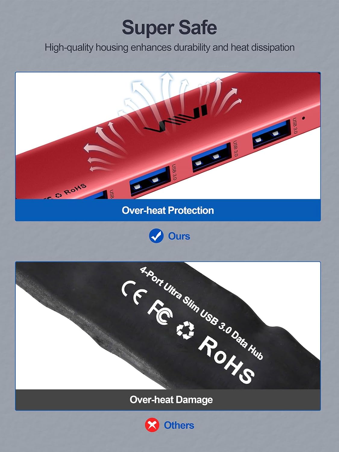 USB 3.0 Hub,4 Port USB Splitter Extender Portable Adapter Multiport Data Hub for Laptop,Xbox, Flash Drive,HDD,Console,Camera,Keyborad,Mouse Windows,Mac OS PC,Not Designed to Charge Devices-Red