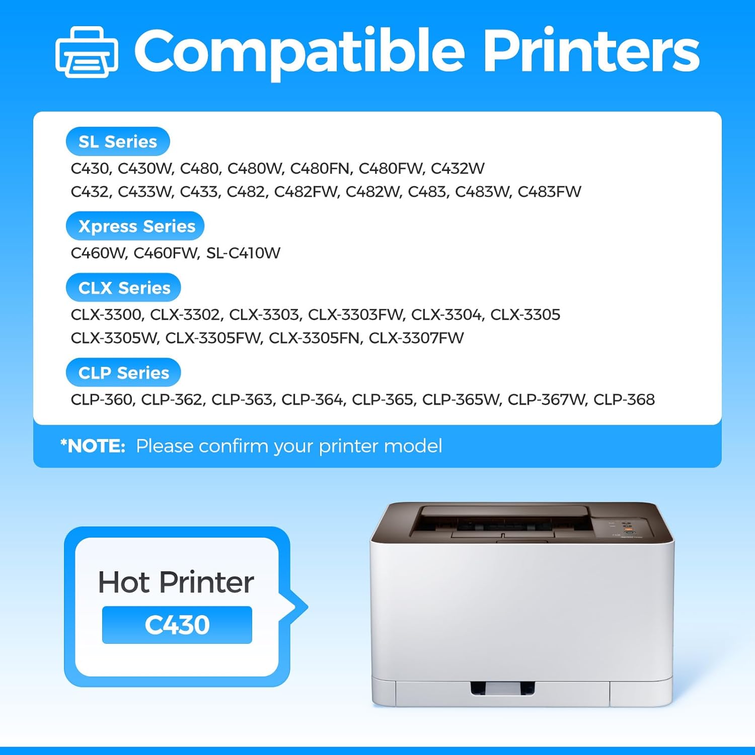 - Compatible Printer: Compatible with Samsung SL Series: C430, C430W, C480, C480W, C480FN, C480FW, C432W, C432, C433W, C433, C482, C482FW, C482W, C483, C483W, C483FW, Xpress Series: C460W, C460FW, SL-C410W, CLX Series: CLX-3300 CLX-3302 CLX-3303 CLX-3303FW CLX-3304 CLX-3305 CLX-3305W CLX-3305FW CLX-3305FN CLX-3307FW, CLP Series: CLP-360 CLP-362 CLP-363 CLP-364 CLP-365 CLP-365W CLP-367W CLP-368 Series Printer.