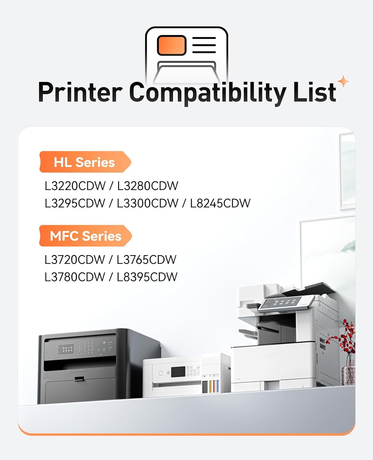 - Compatible Printers: Compatible with Brother HL-L3220CDW HL-L3280CDW HL-L3295CDW HL-L3300CDW HL-L8245CDW Series Printer; MFC-L3720CDW MFC-L3765CDW MFC-L3780CDW MFC-L8395CDW Series Printer.
