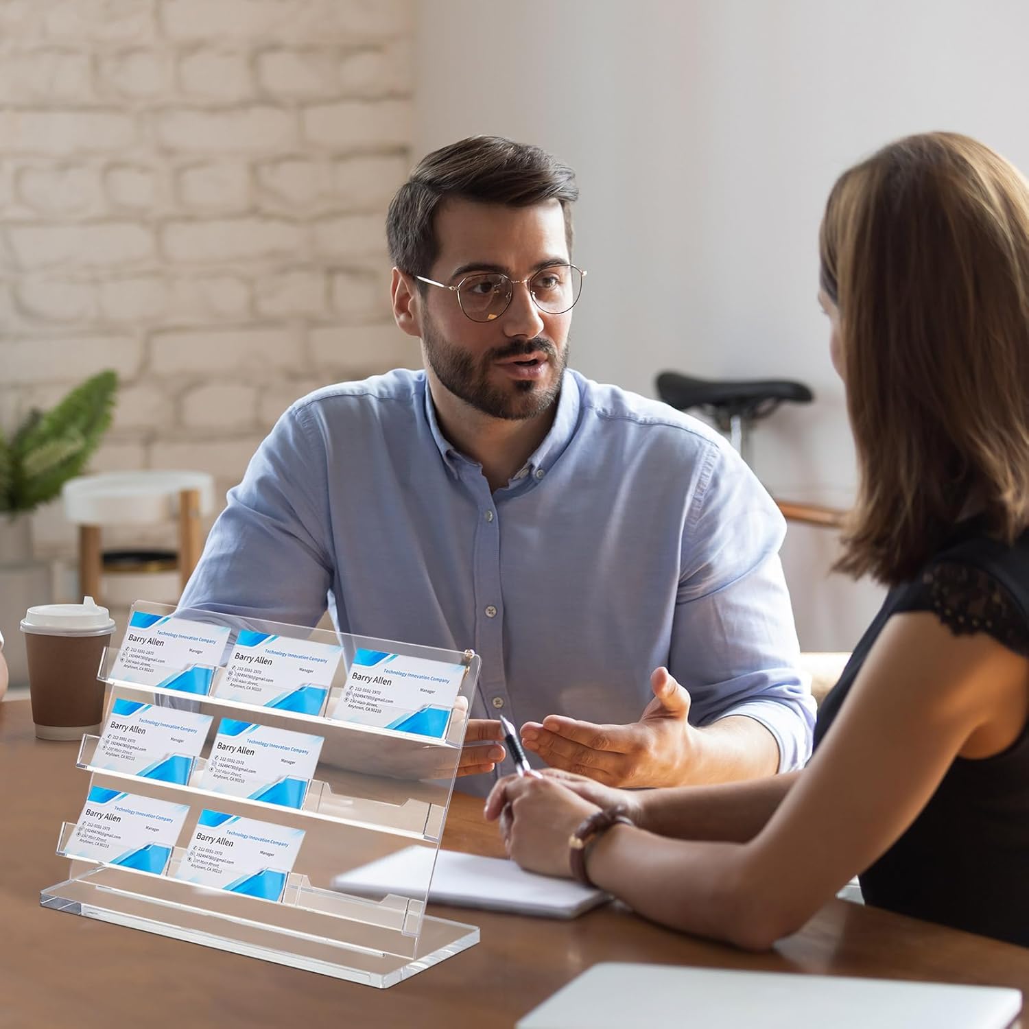 - Modern Transparent Design: made of high definition clear acrylic, our acrylic desk business card organizer can better display your business cards for maximum visibility; The transparent design makes it easy to identify and select the right card; The elegant and stylish business card holder display serves as a functional and decorative piece that adds a touch of sophistication to your desk or tabletop