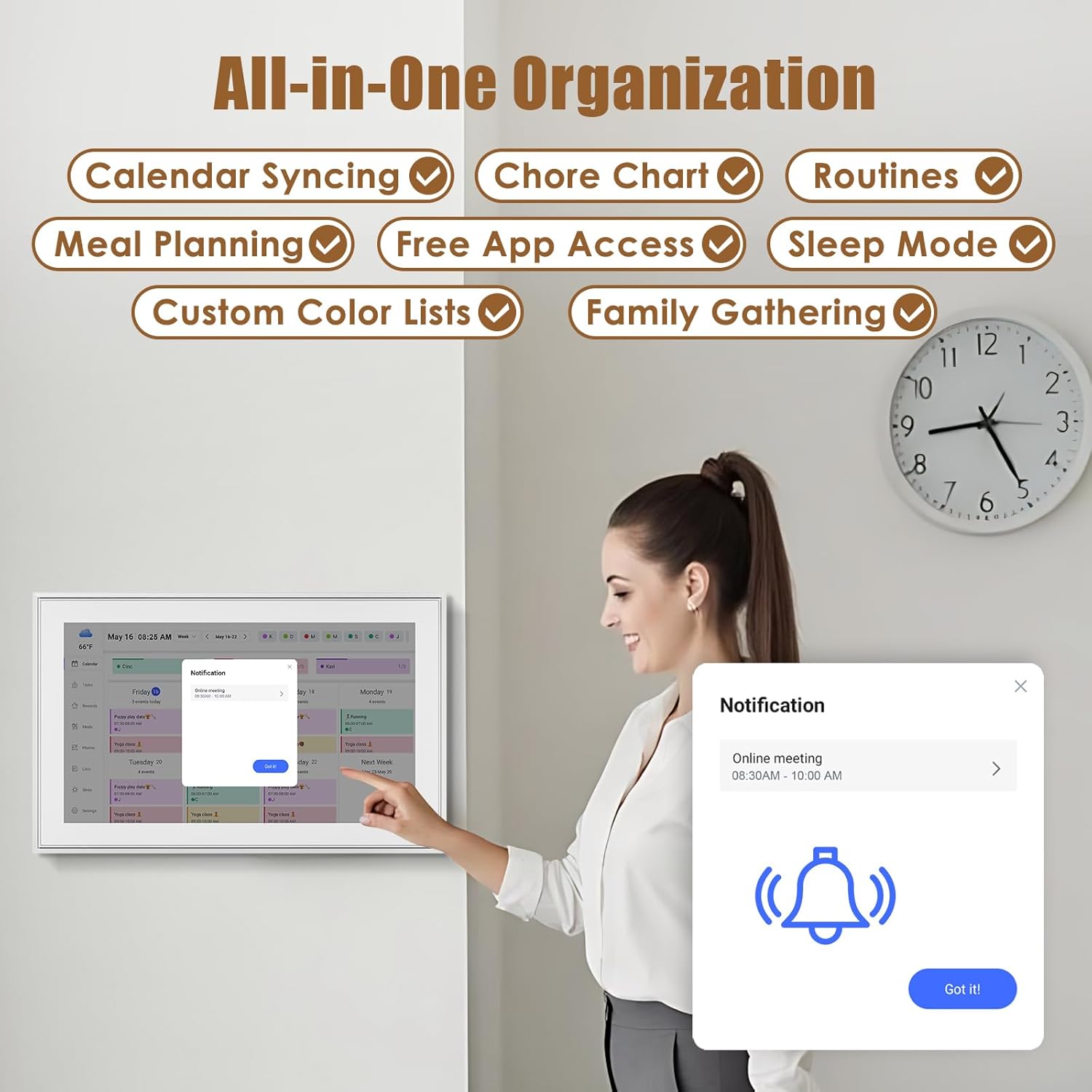 • ✅Perfect Gift for Everyone:Perfect gift for Mother's Day, Father's Day, Valentine's Day, Thanksgiving, Christmas, Wedding, Birthday and so on. It has multi-functions, such as photos/videos, sleep mode, adjustable brightness. Customize your digital wall calendar touch screen with colors and unique tag names.Share your calendar with friends, family, or colleagues and coordinate plans effortlessly. Can view and edit the calendar the same time, Support permission classification, Assign tasks to multiple person and track project progress.