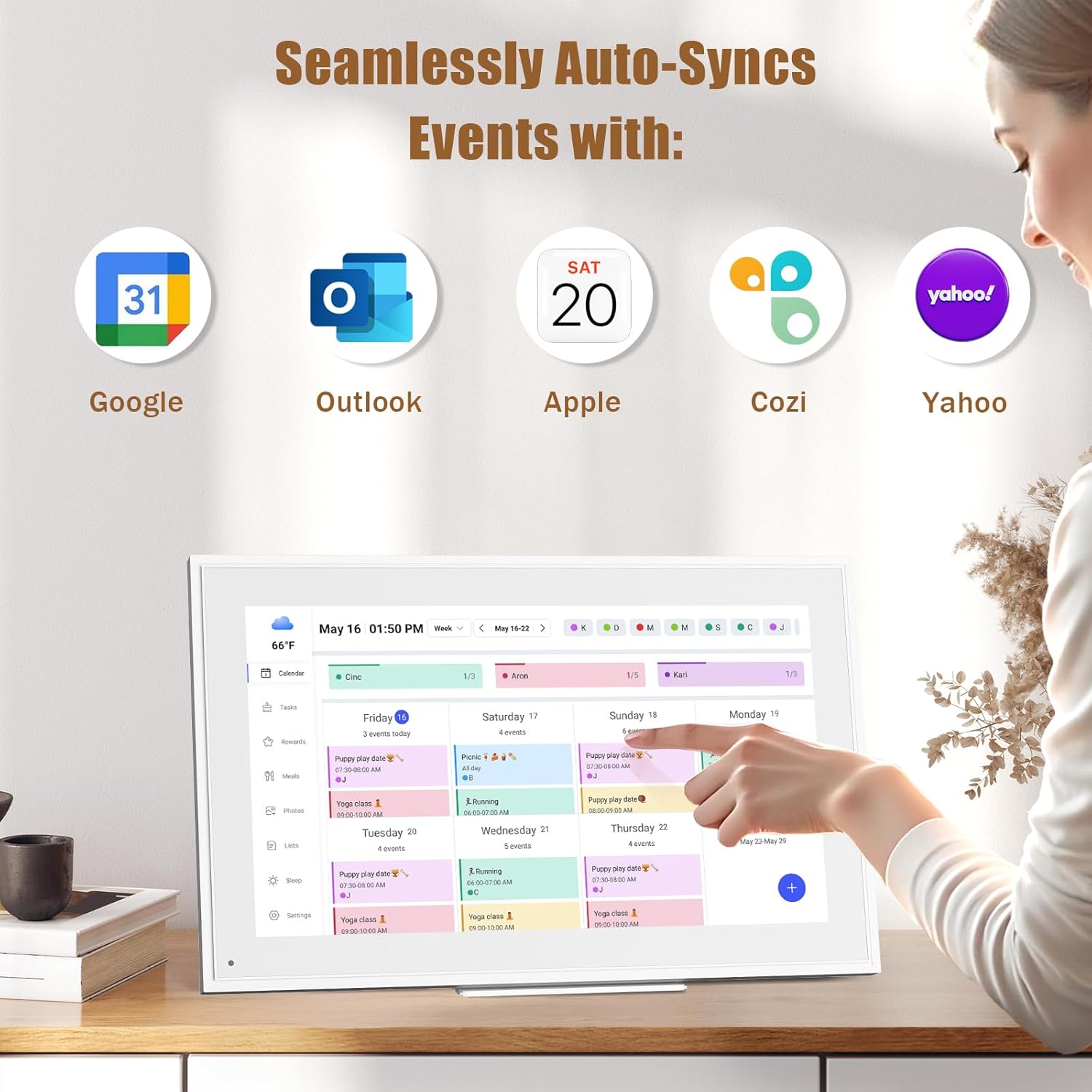 • ✅Easy Set- Up, Seamless Calendar Syncing:Just plug in the device, connect to Wi-Fi and sync your calendars.all your events will automatically populate and sync in minute. Compatible with Google, iCloud, Outlook, Cozi, and Yahoo. Add events directly on the device or through the eCalendar app.