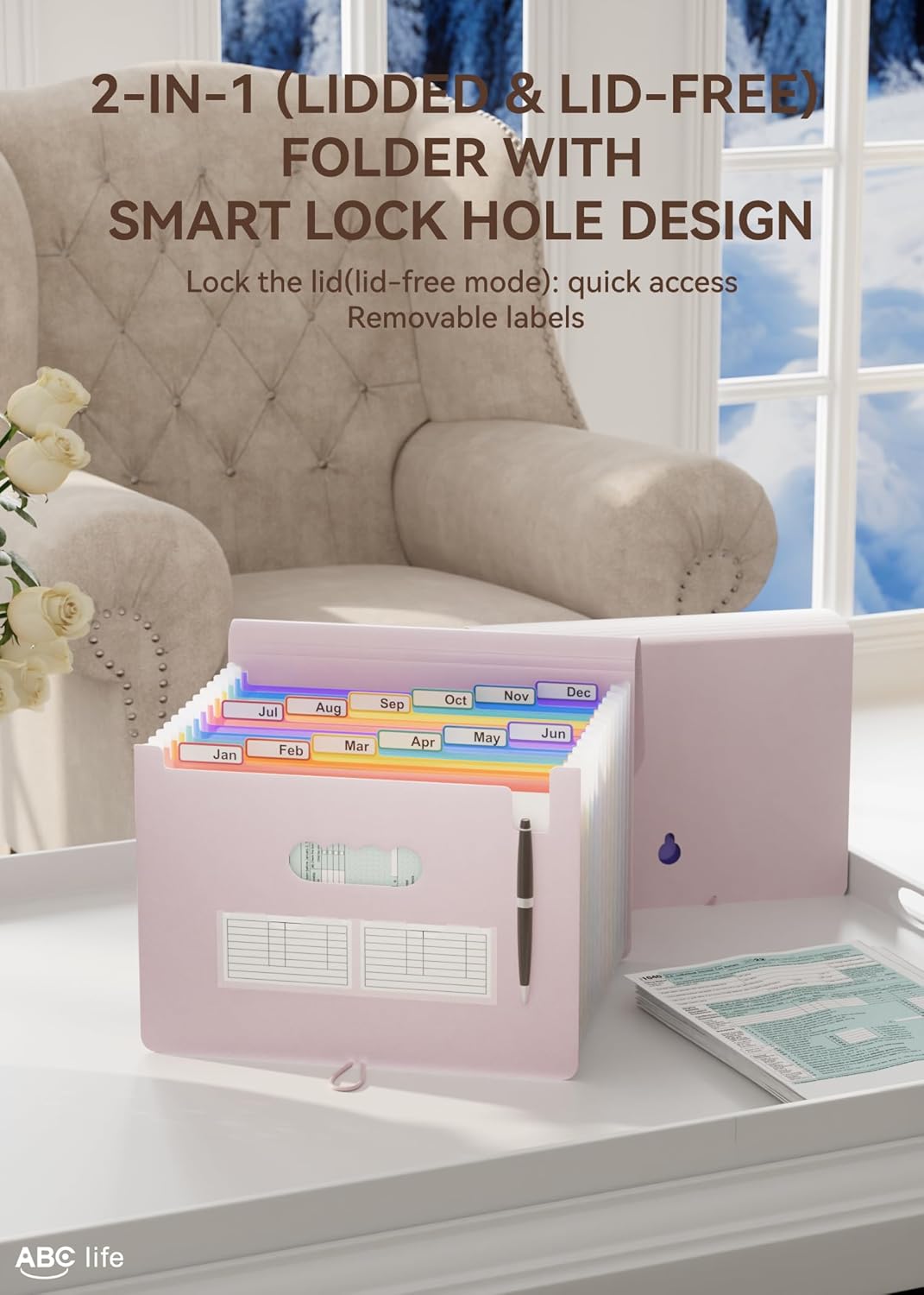 - 【EASY CATEGORIZE】Unique Jan-Dec large tabs and color inner pages design help you to classify your files effectively. Perfect for organizing by month.Upgraded small hole design-the small hole on the back can lock the lid, converting it into a lid-free mode. Frequently used files can be accessed instantly—no more repeated opening and closing.