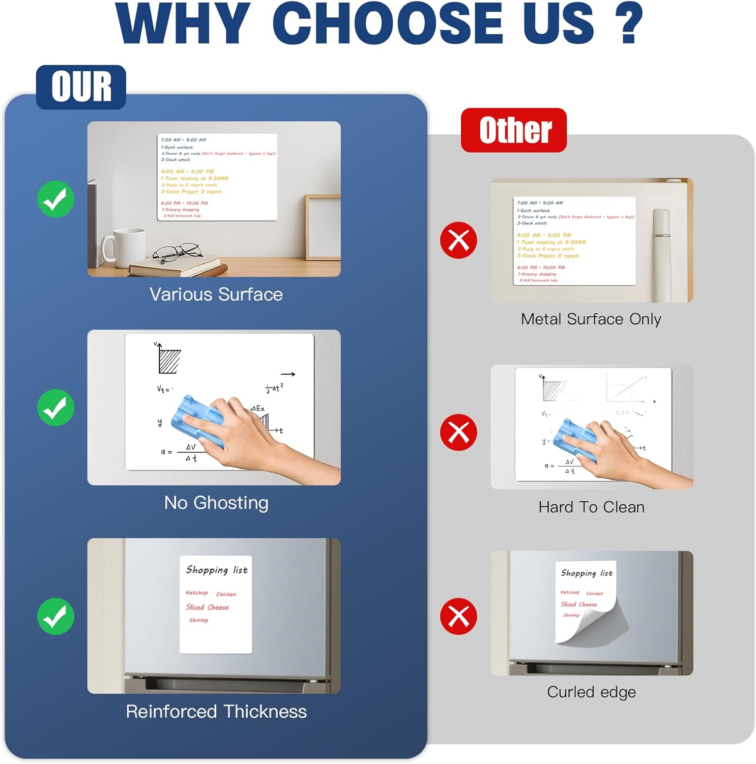 - đ Adhesive Small Dry Erase Board - No Magnets Needed! đčPeel-Stick Freedom: Securely adheres to tile, glass, wood, plastic & textured wallsâno metal surfaces required! Ideal for rentals, classrooms, and curved cabinets where magnetic boards fail.