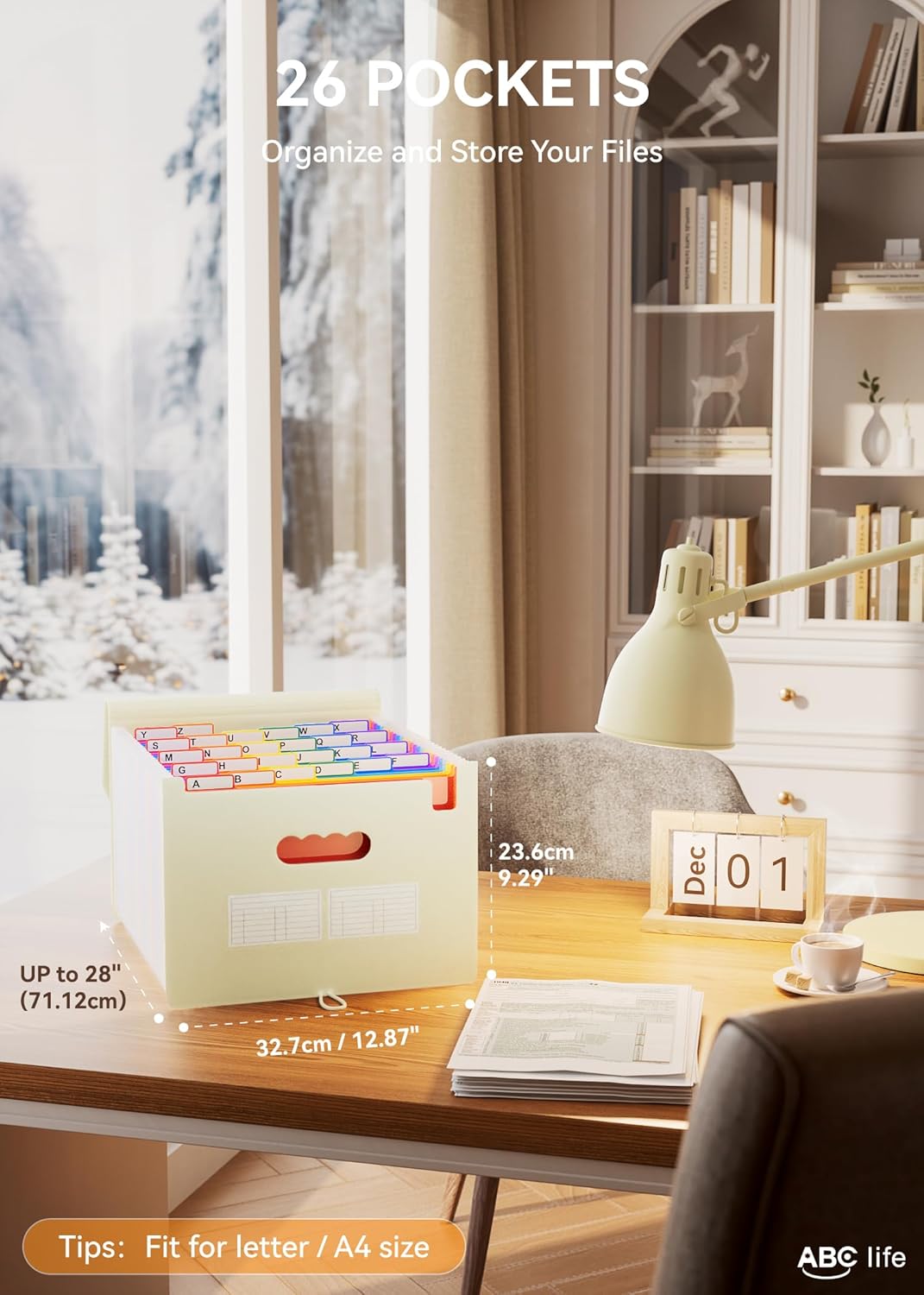 - 26 Expanding File Folder: ABC life pockets accordian file organizer suitable for filing tax and storing important family documents. Product size is 13 "x 9.4"x 28", top and bottom are both expandable, For letter/A4 size files.