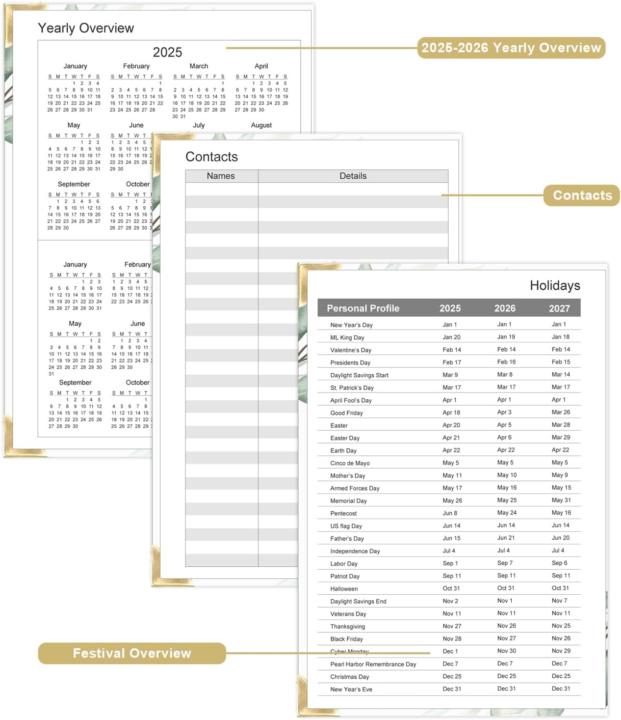 • 224 SHEETS / 448 PAGES - This undated planner measures 5.8 x 8.5 inches, a comfortable size for daily use and carrying. The planner notebook includes a Yearly Overview, Personal Information, Contacts, Important Dates, Monthly Pages, Daily Pages, Notes Pages, and a festival overview page covering 2025-2027. It comprehensively contains everything needed for daily use.