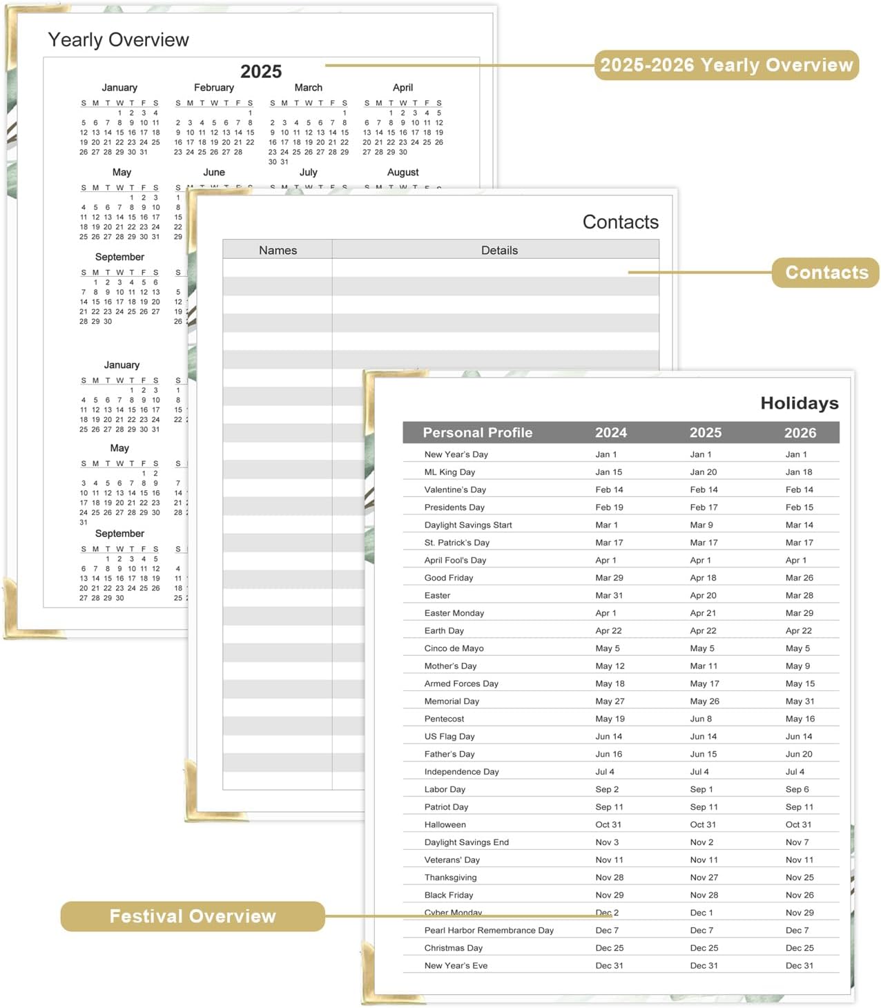 • 224 SHEETS / 448 PAGES - This undated planner measures 8.5 x 11 inches, a comfortable size for daily use and carrying. The planner notebook includes a Yearly Overview, Personal Information, Contacts, Important Dates, Monthly Pages, Daily Pages, Notes Pages, and a festival overview page covering 2025-2027. It comprehensively contains everything needed for daily use.