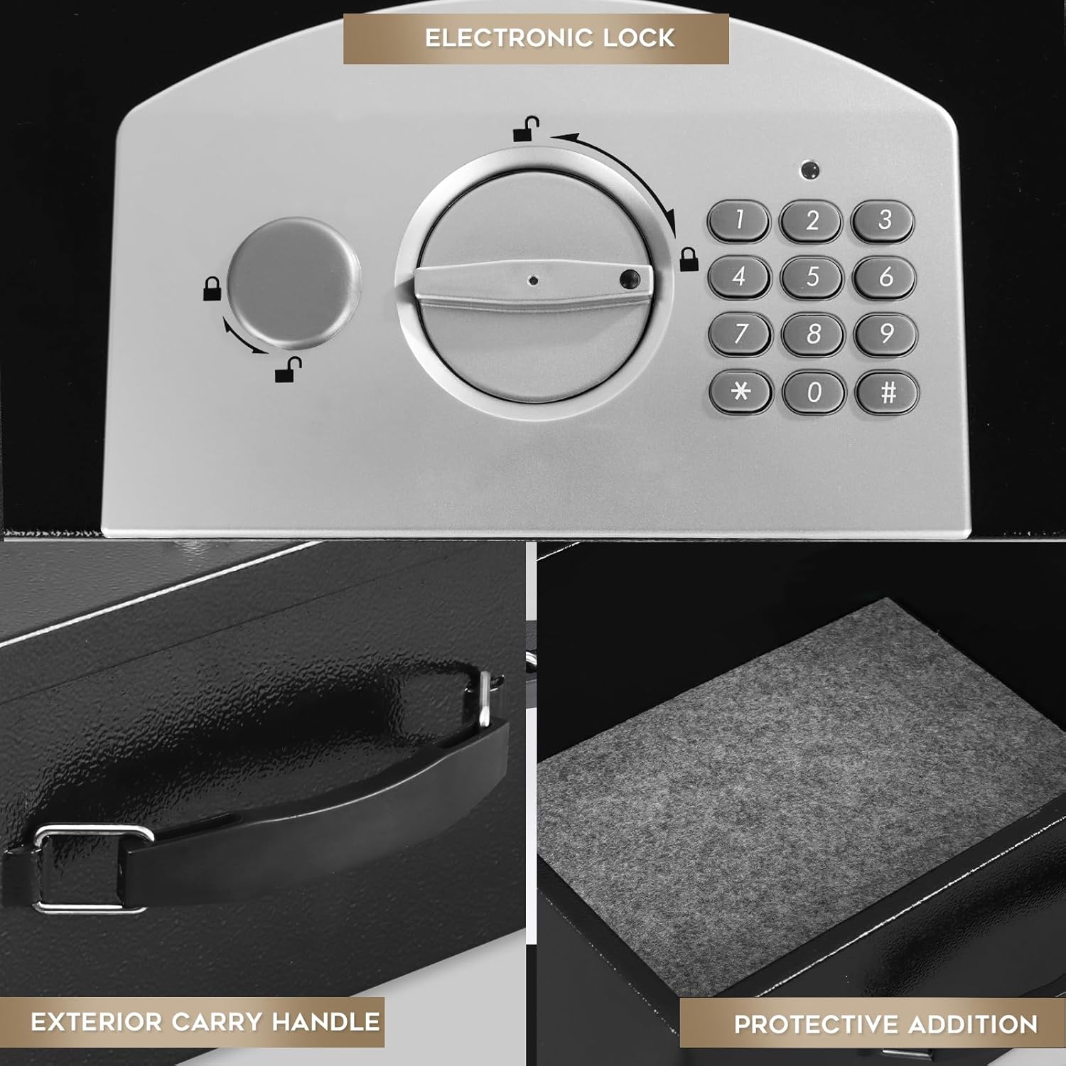 - 【HIGH SECURITY】The electronic lock is equipped with a keypad for easy access and includes 2 backup keys in case of power outages. Protect your valuables with a fire-resistant digital code lock safe. Your assets will be safe from fire and theft.(ATTENTION:Need to prepare four AA batteries by yourself)