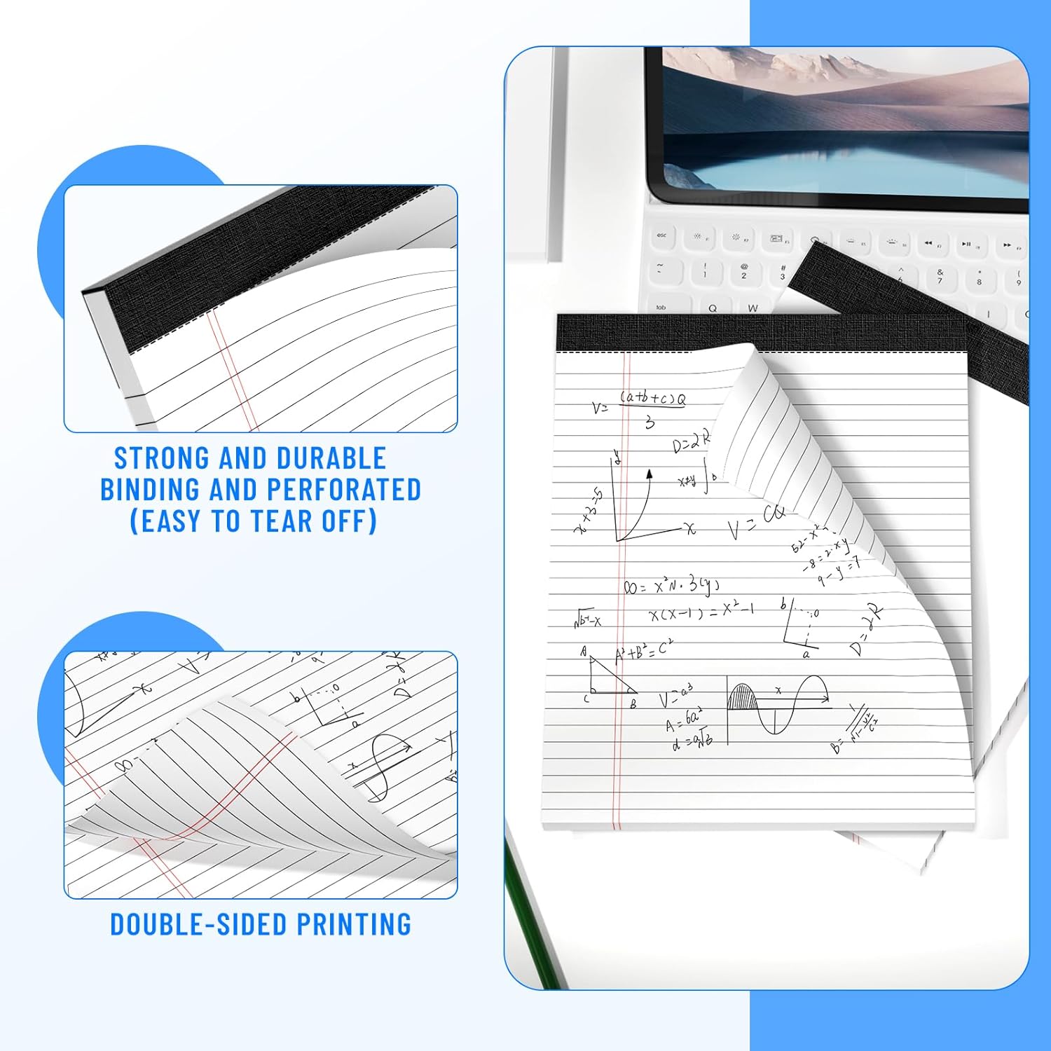 - STURDY CHIPBOARD BACKING: Writing is well supported with thick, sturdy backing, durable and long-lasting, and the heavy-duty binding ensures that pages won't fall apart. The notepad is perfect for everyday use in a variety of occasions, whether at home, school, the office, or on the go.