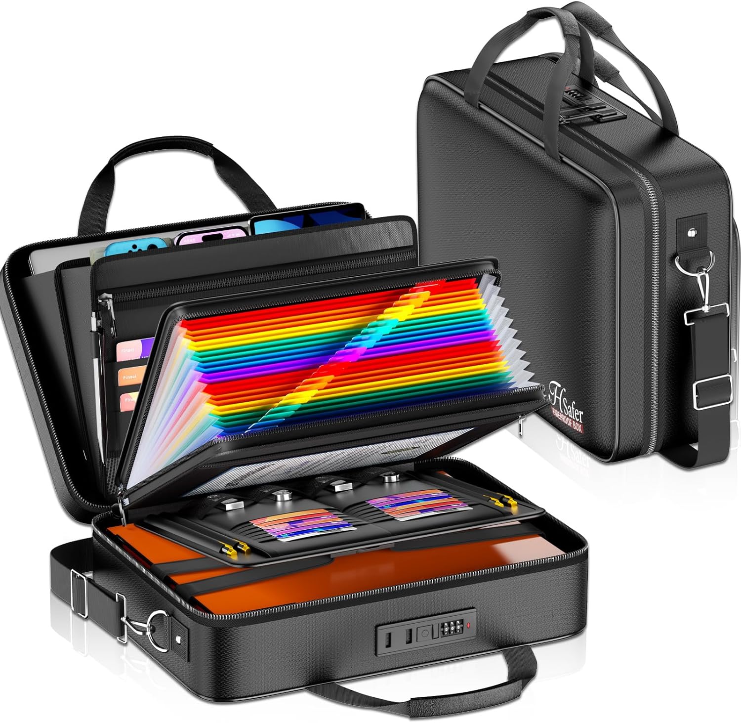 Fireproof Document Box with Lock, Hard-Shell Case File Organizer with 24 Pocket Accordion File Folder, Portable Safe Box with Shoulder Strap for Home Important Documents Laptop Black