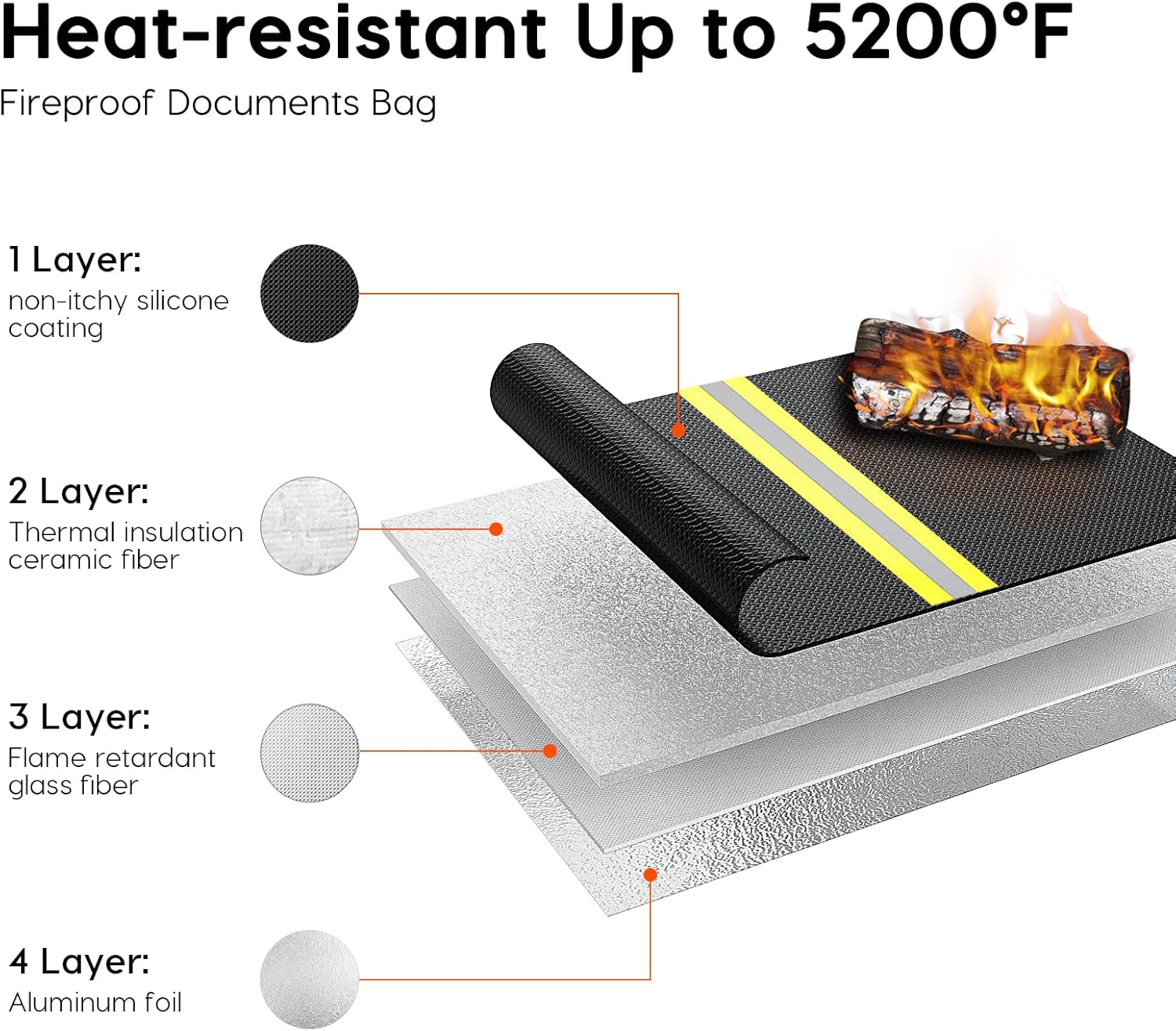 - 5200°F Fire Protection:Made with 8 layers of fireproof insulation, this fireproof document bag can withstand temperatures up to 5200°F, giving you plenty of time to rescue your important documents and valuables from a fire
