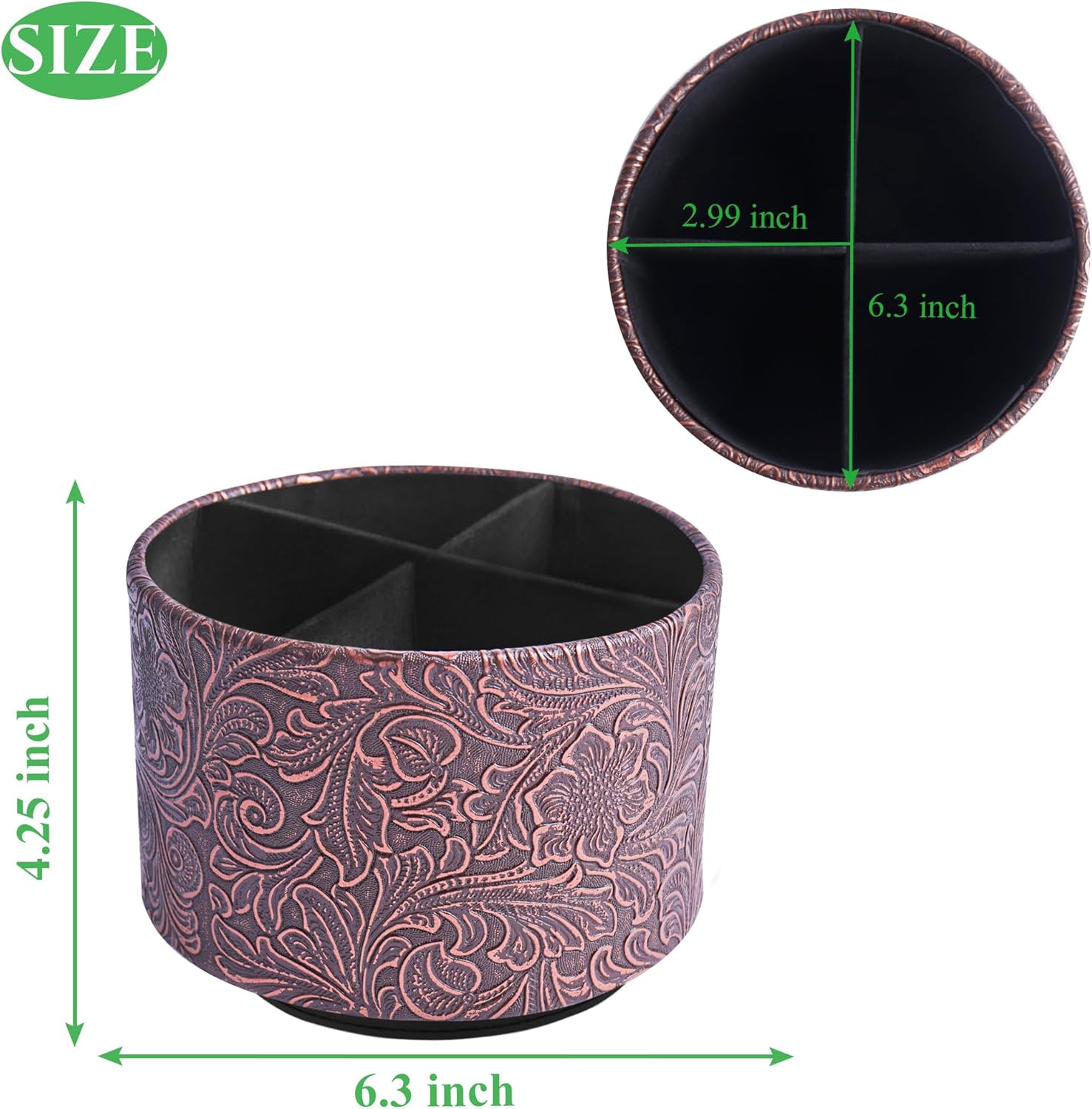 lizimandu Round Leather Art Supply Organizer,Remote Control Holder,360 Degree Spinning,Multi-Functional Pencil Holder,4 Compartments Desktop Stationary Organizer(1-Carved Cooper Red)