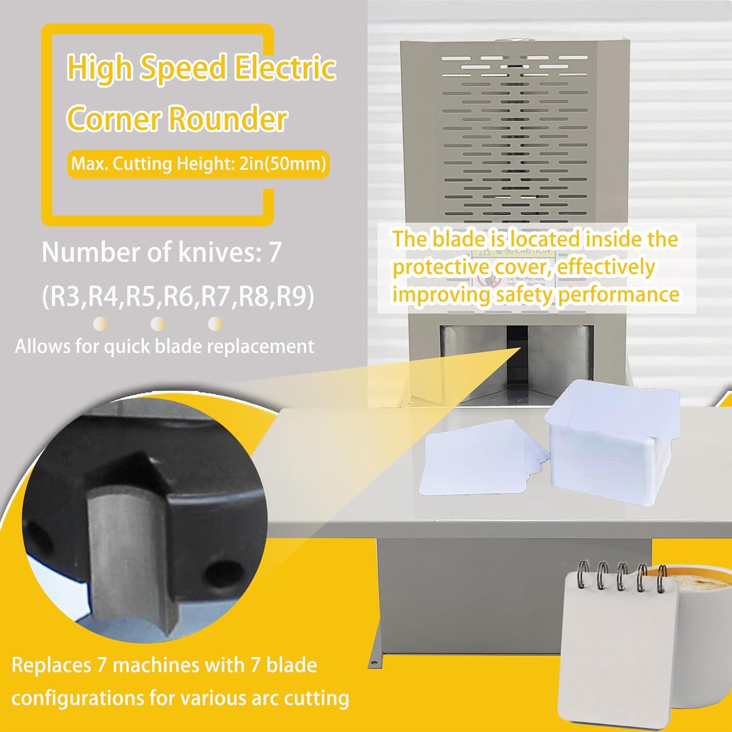 Electric Corner Rounder Machine 50mm Capacity Round Corner Cutter with Safety Guard & Foot Pedal 7PCS Blades R3-R9 Commercial Corner Rounding for Documents Certificates Books Packaging