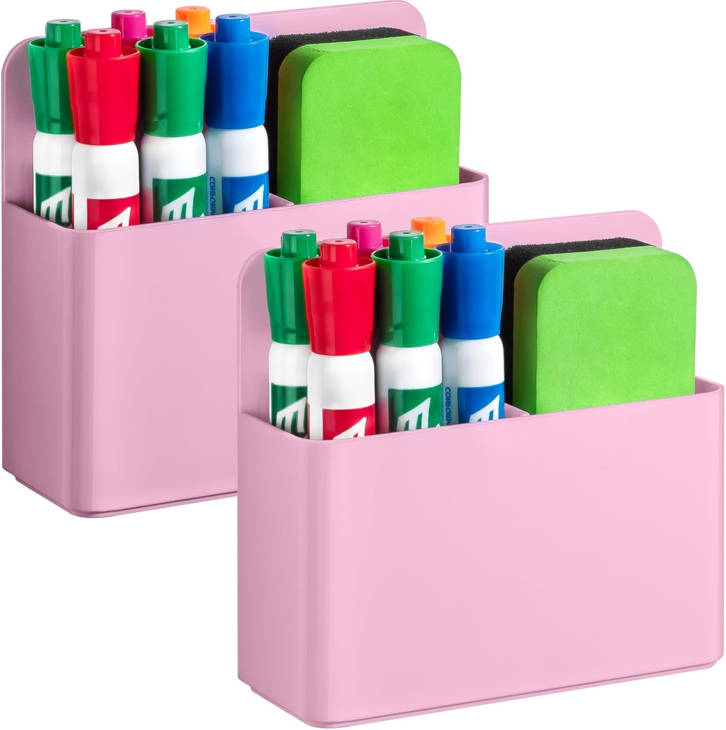 2 Pcs Magnetic Dry Erase Marker Holder for Whiteboard, Plastic Magnetic Pen Holder for Refrigerator Fridge, Magnet Pencil Cup for School Classroom, Locker Accessories, Pen Cup Organizer-Pink