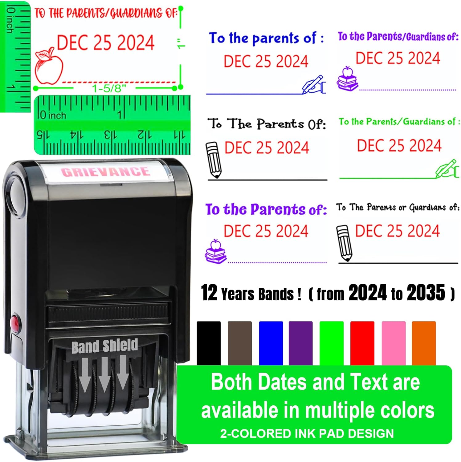 - 【Personalized Teacher Stamps with Date and Signature】:Our to The Parents or Guardian of stamp is available in 2-colored ink pad(Text and date are available in 8 colors each for choice) and multiple fonts.Each parent signature stamp is designed with adjustable date and sign line,impression size:1" x 1-5/8".Teacher stamps provide a crisp print on the paper without bleeding.Teacher date stamp have 12 years bands, over 10 years of use guaranteed (from 2024 to 2035) and US format in MMM-DD-YYYY