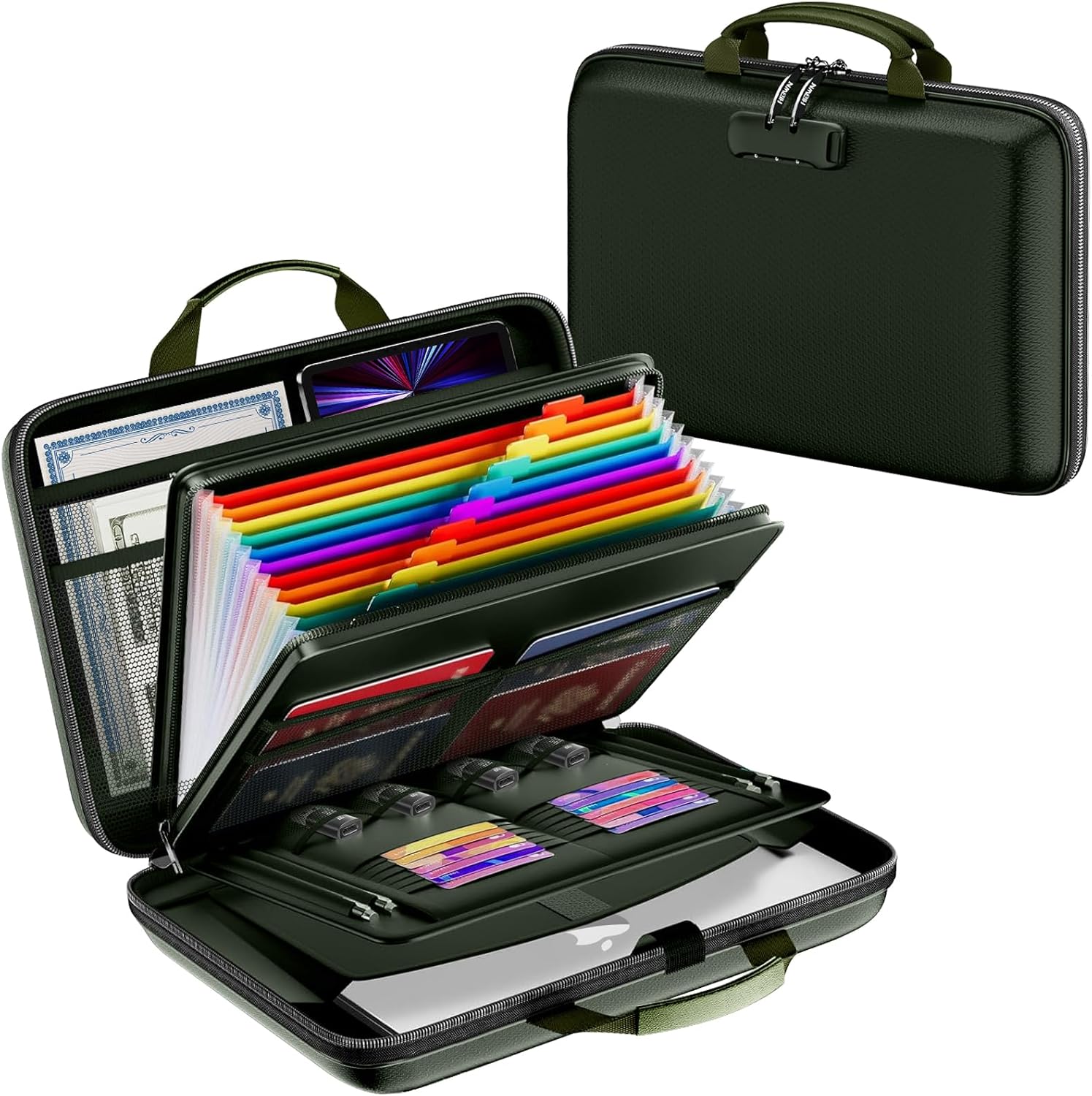 Fireproof Document Box, Hard Case Fireproof File Organizer Box with Lock and 13 Pocket Accordion File Folder, Portable Safe Box for Home Office Travel to Storage Important Documents Laptop Green