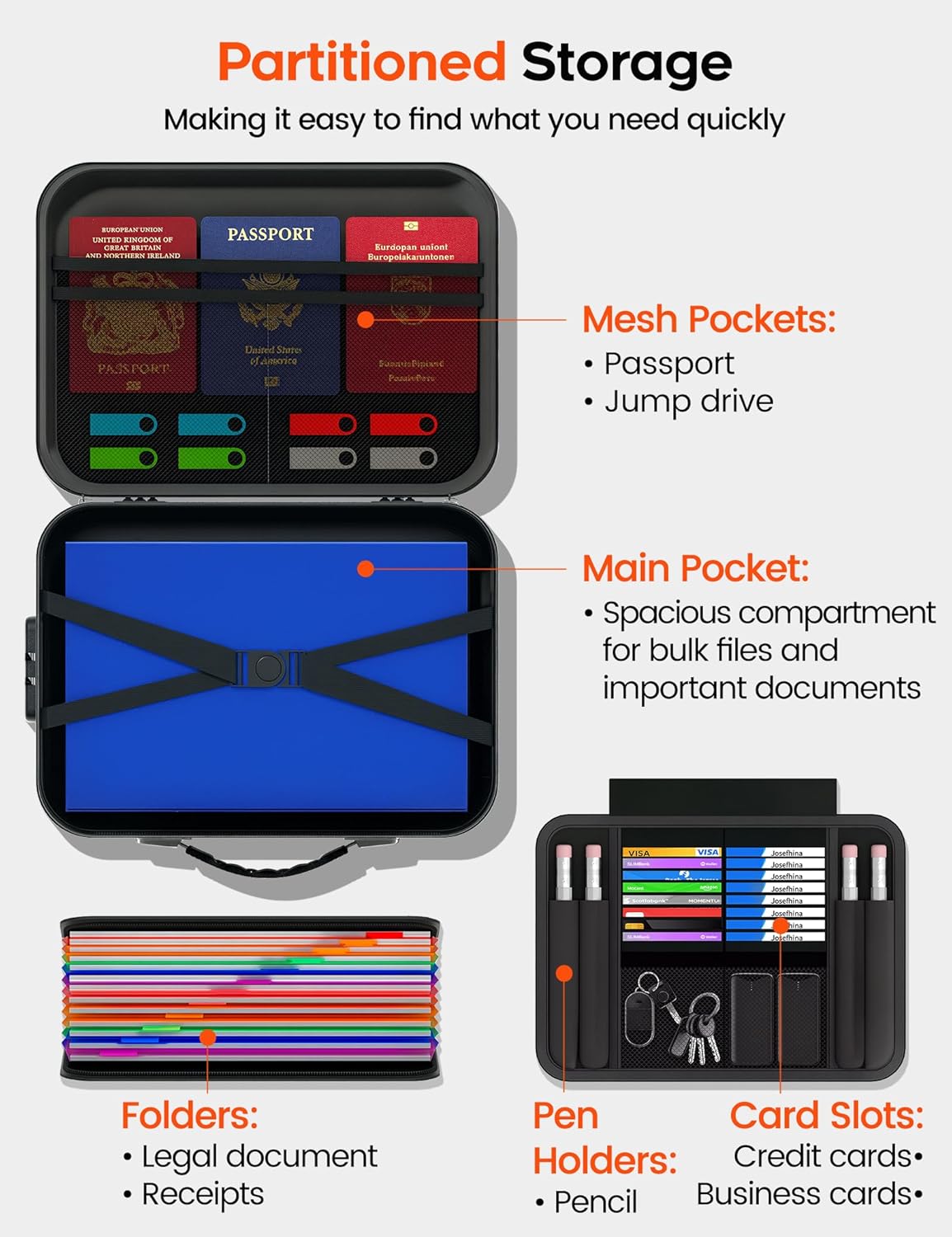 - Spacious & Organized Storage: Measuring about 14.57x10.8x5.32 inches, fire proof file box includes accordion folders, mesh pockets, card slots, USB pockets, and pen holders, offering large capacity and structured organization