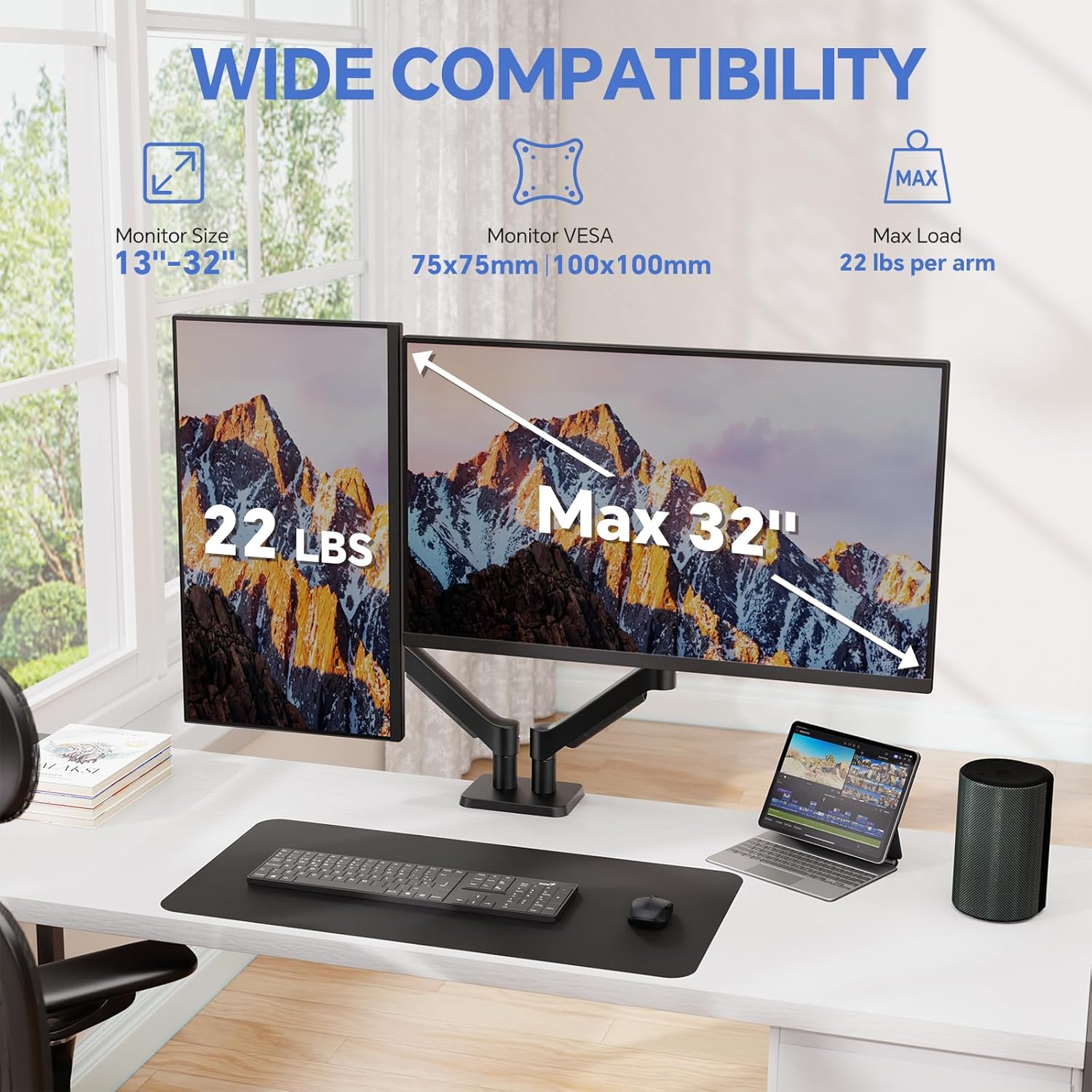 - Universal Monitor Desk Mount: The dual monitor stand fits screens 4.4lbs - 22 lbs in weight and 13-32 inches diagonal; compatible with VESA patterns 75x75 mm and 100x100 mm. You Should NOTE that Pneumatic Monitor Arms for 2 Monitors Max 24 Inches.