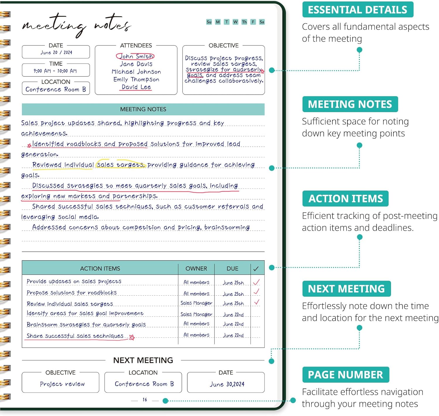 • Boost Meeting Efficiency: A meeting notebook helps you manage and streamline meeting details, ensuring discussions, decisions, and action items are accurately captured and organized. It promotes a more efficient workflow, allowing for easy reference and retrieval of information during and after the meeting.