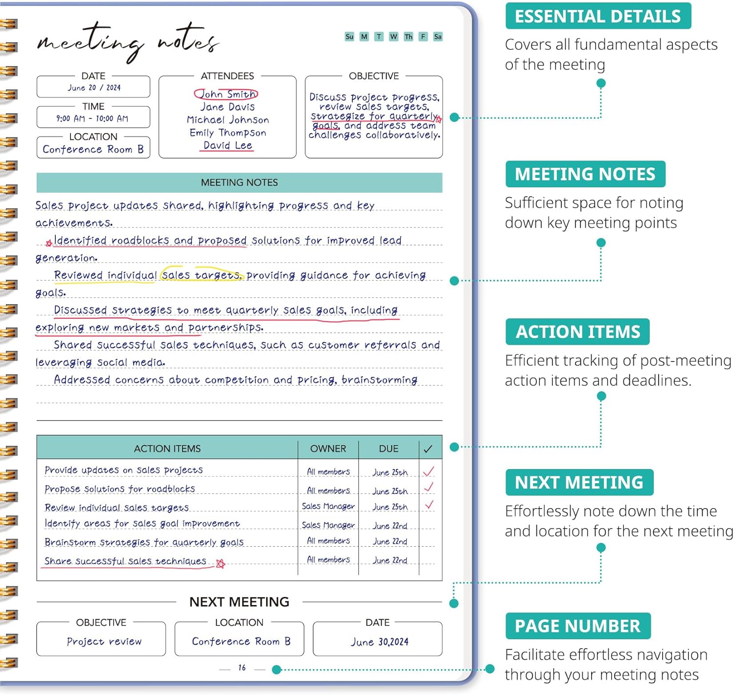 • Boost Meeting Efficiency: A meeting notebook helps you manage and streamline meeting details, ensuring discussions, decisions, and action items are accurately captured and organized. It promotes a more efficient workflow, allowing for easy reference and retrieval of information during and after the meeting.