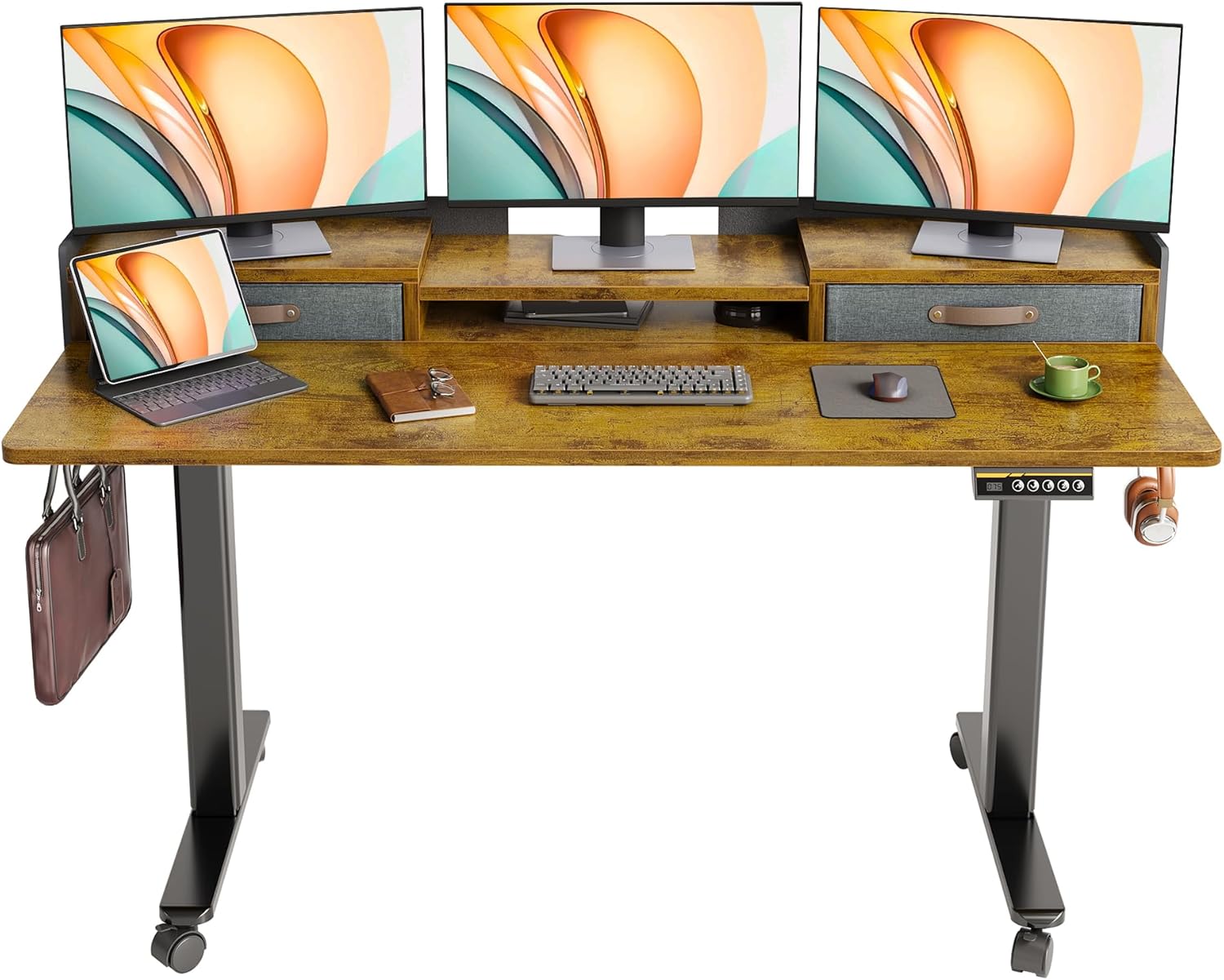 YDN Rustic Brown 2-Tier Adjustable Electric Standing Desk, 59 inch, Modern Design with 2 Drawers, Felt Fence, Hook, for Office