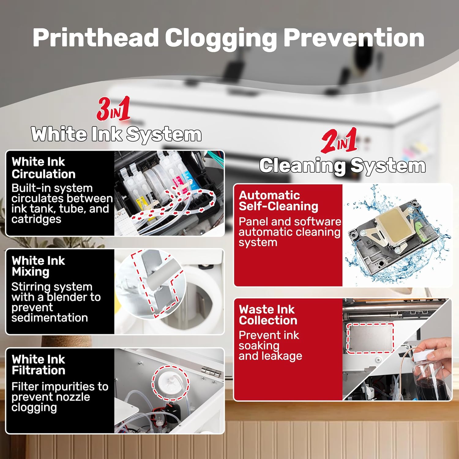 - Special Feature : 3-in-1 white ink system prevents clogging while ensuring premium white ink quality., Adjustable air suction secures transfer film for stable, continuous operation., Complete printhead protection kit safeguards printheads during extended idle periods., Free handheld heat press tool for quick touch-ups and small transfers., R1390's six-color system delivers exceptional image quality with true-to-life colors and sharp details. 3-in-1 white ink system prevents clogging while ensuring premium white ink quality., Adjustable air suction secures transfer film for stable, continuous operation., Complete printhead protection kit safeguards printheads during e⦠See more