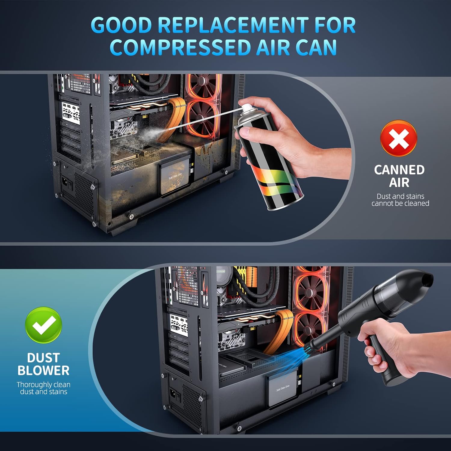 - Eco-Friendly & Rechargeable Air Duster This cordless electric air duster replaces disposable canned air, offering a sustainable and cost-effective solution. Recharge and reuse it repeatedly, reducing waste and saving money over time.