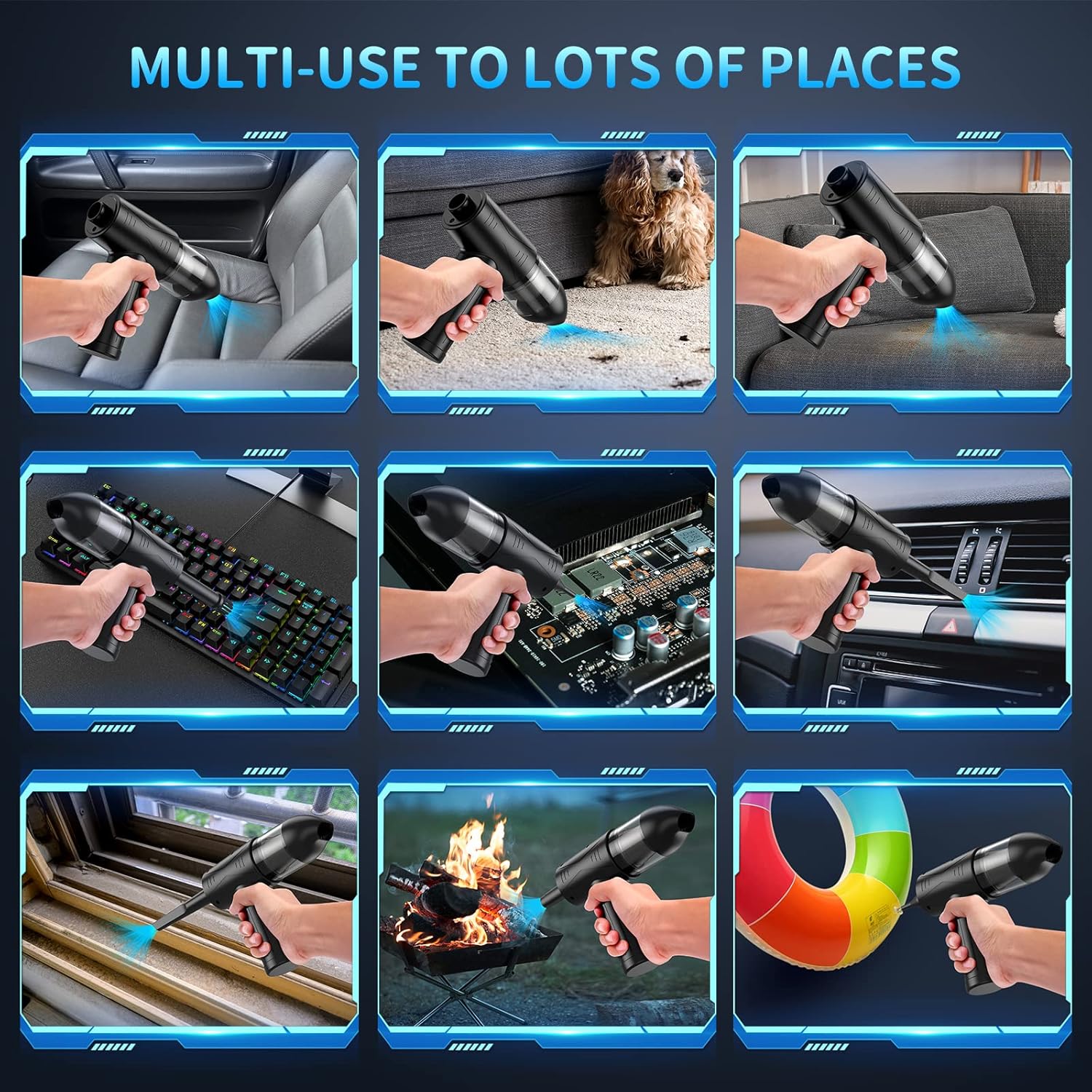 - Versatile Multi-Surface Blower Perfect for cleaning hard-to-reach areas like tight corners, car seats, blinds, and more. The extended nozzle allows precision cleaning, while the strong airflow can even assist with inflating small items.