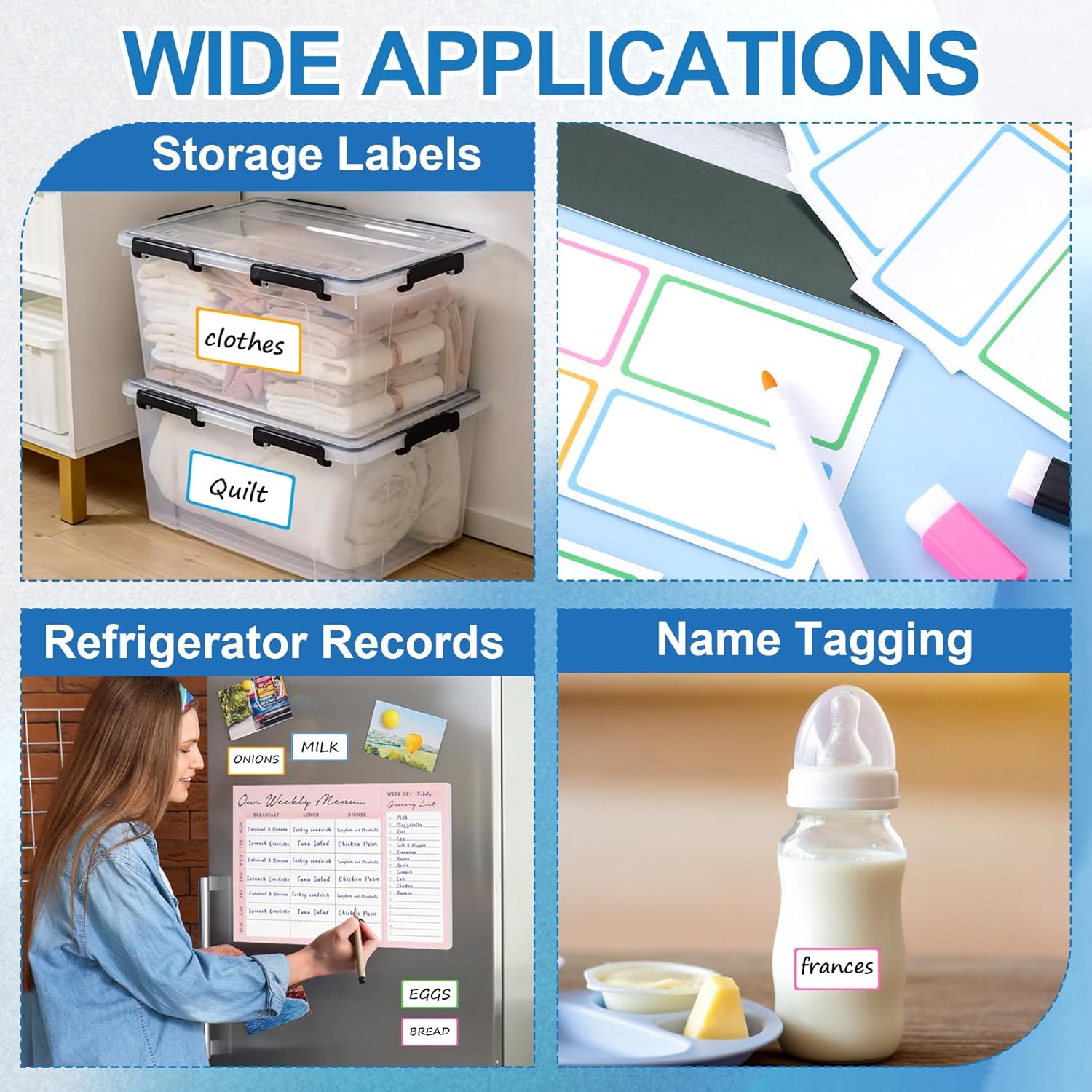 - Widely Used: These dry erase stickers are suitable for smooth surfaces such as storage boxes, bottles, computers, desktops, fridges, and walls. They can act as can labels, info notes, name stickers, and work well in offices, kitchens, homes, coffee shops, and more